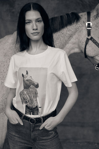 Front view of a model wearing the white equestrian t-shirt with a black horsie print from Riders Denim.