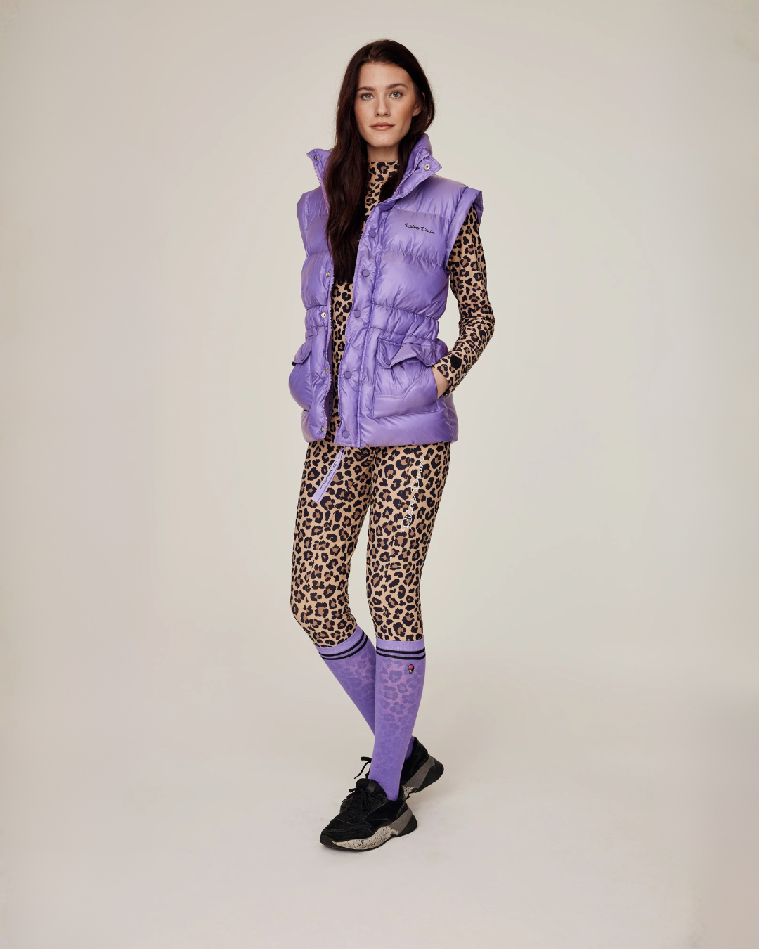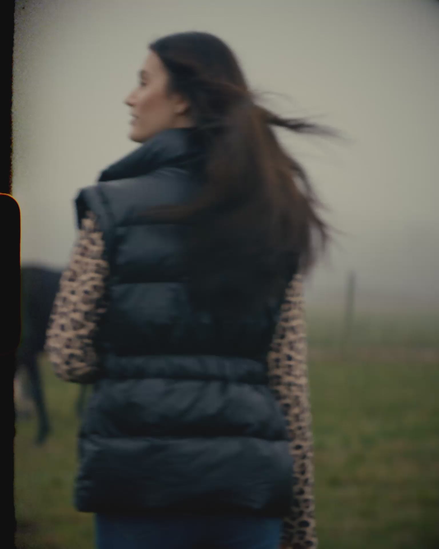 Smiling model in a stable setting wearing an unzipped lilac and zebra teddy jacket with a grey horse in the background.